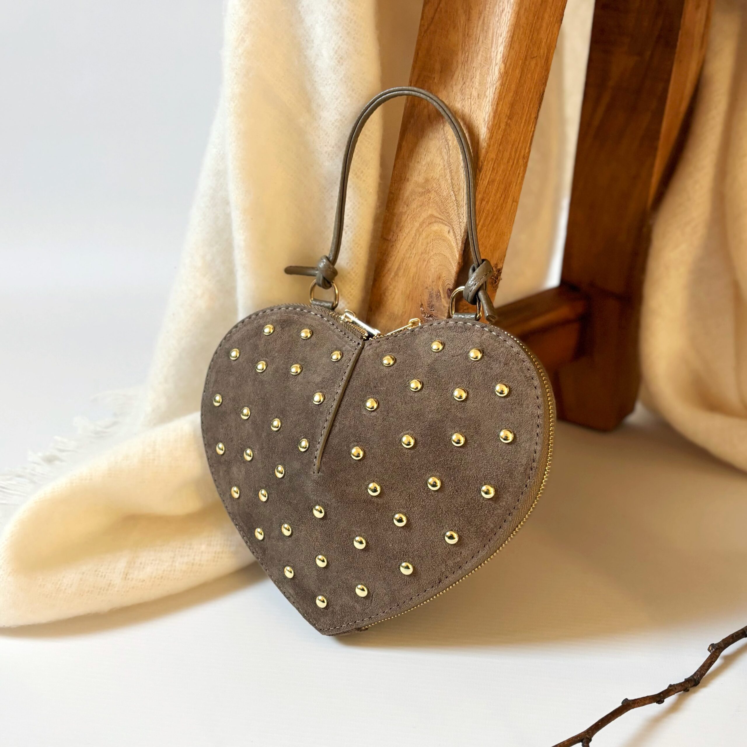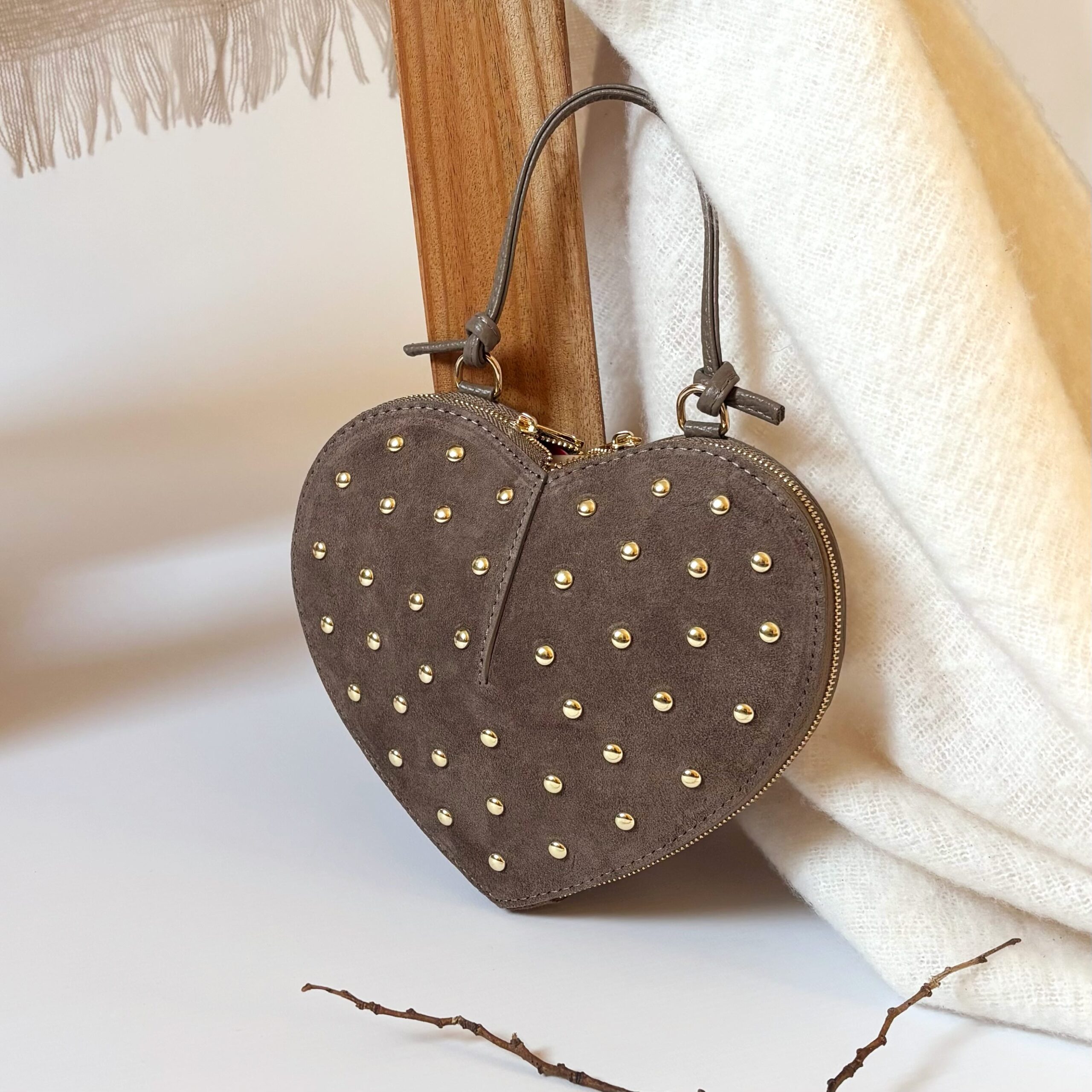 Une silhouette tendre, sculptée dans un cuir suédé velouté et ponctuée d’éclats dorés.