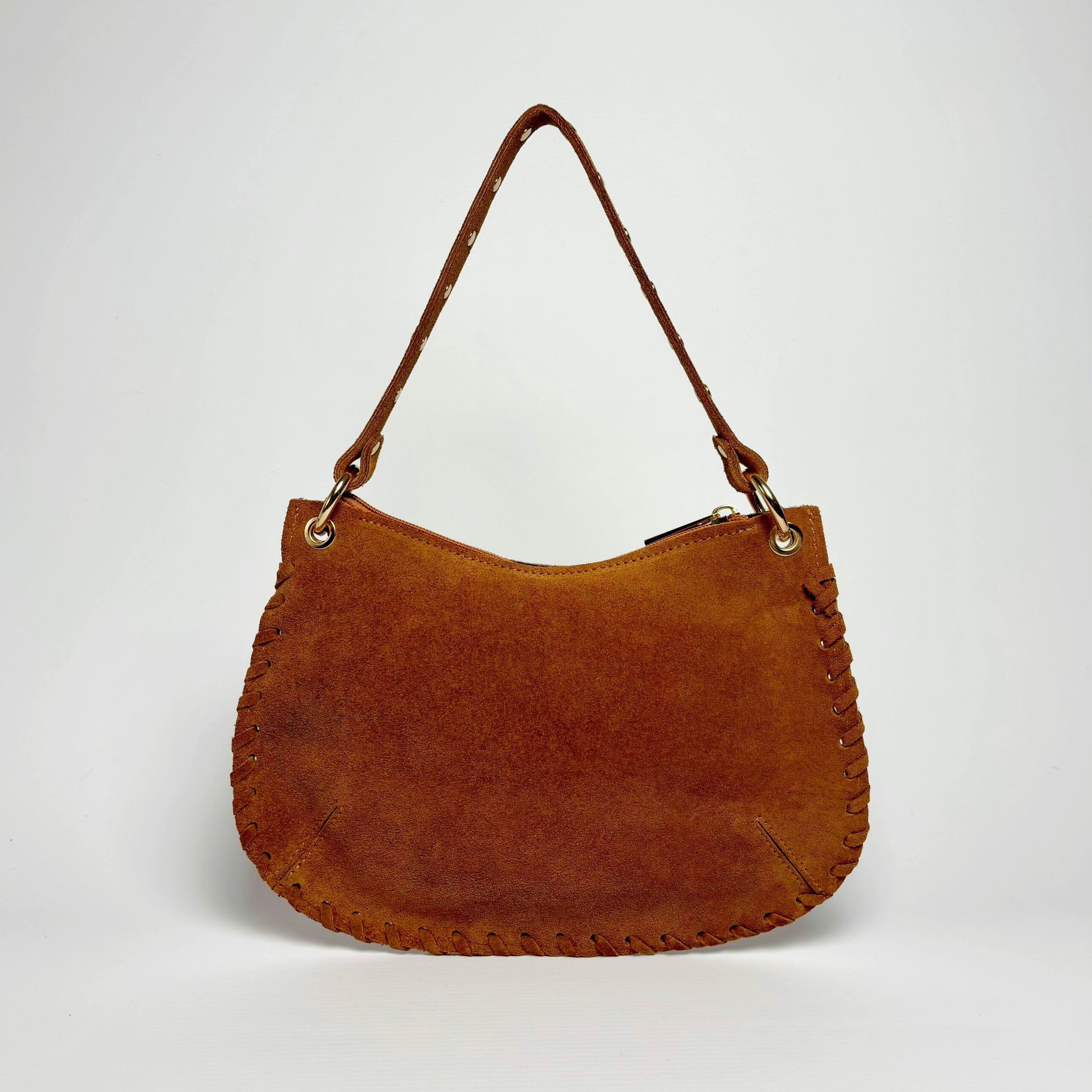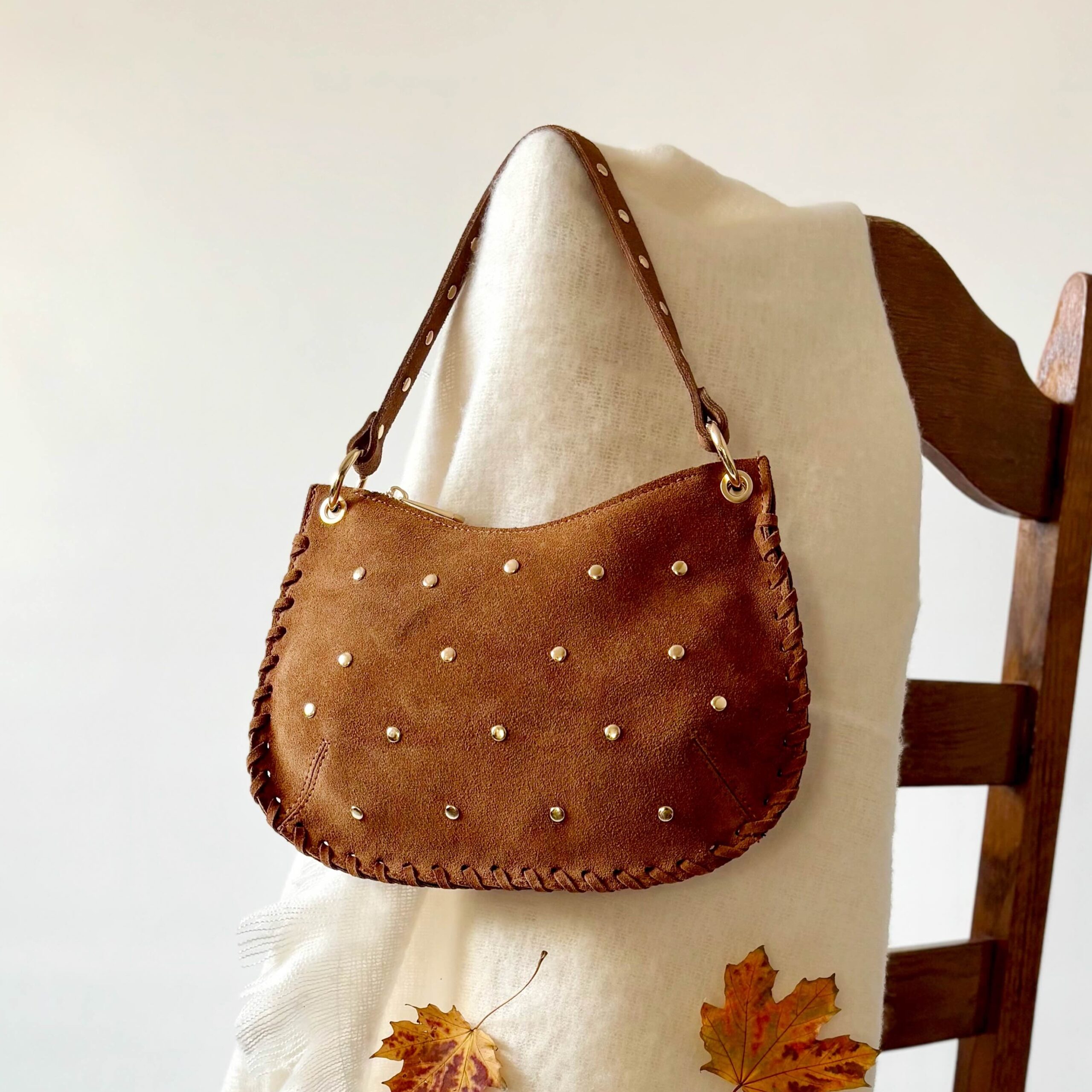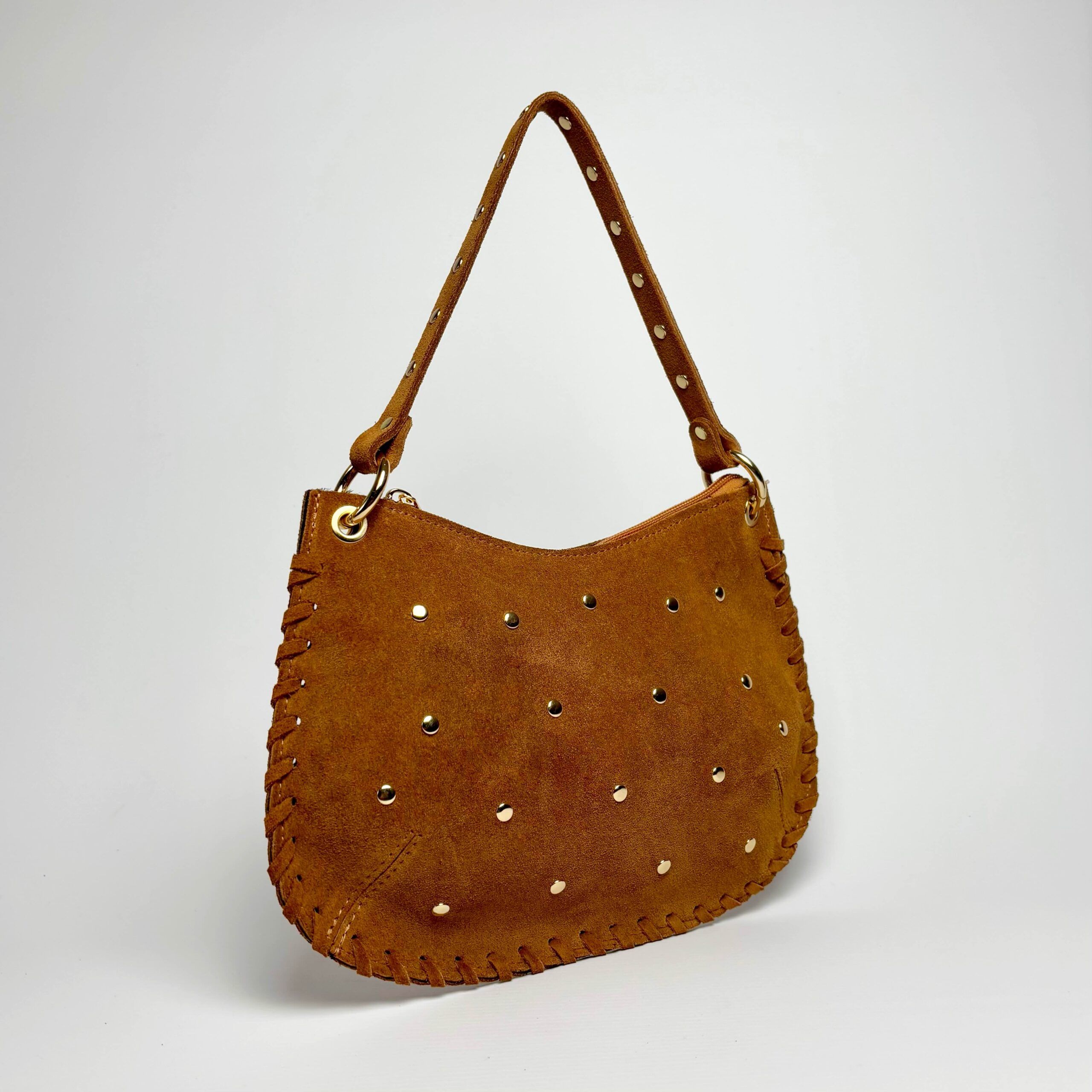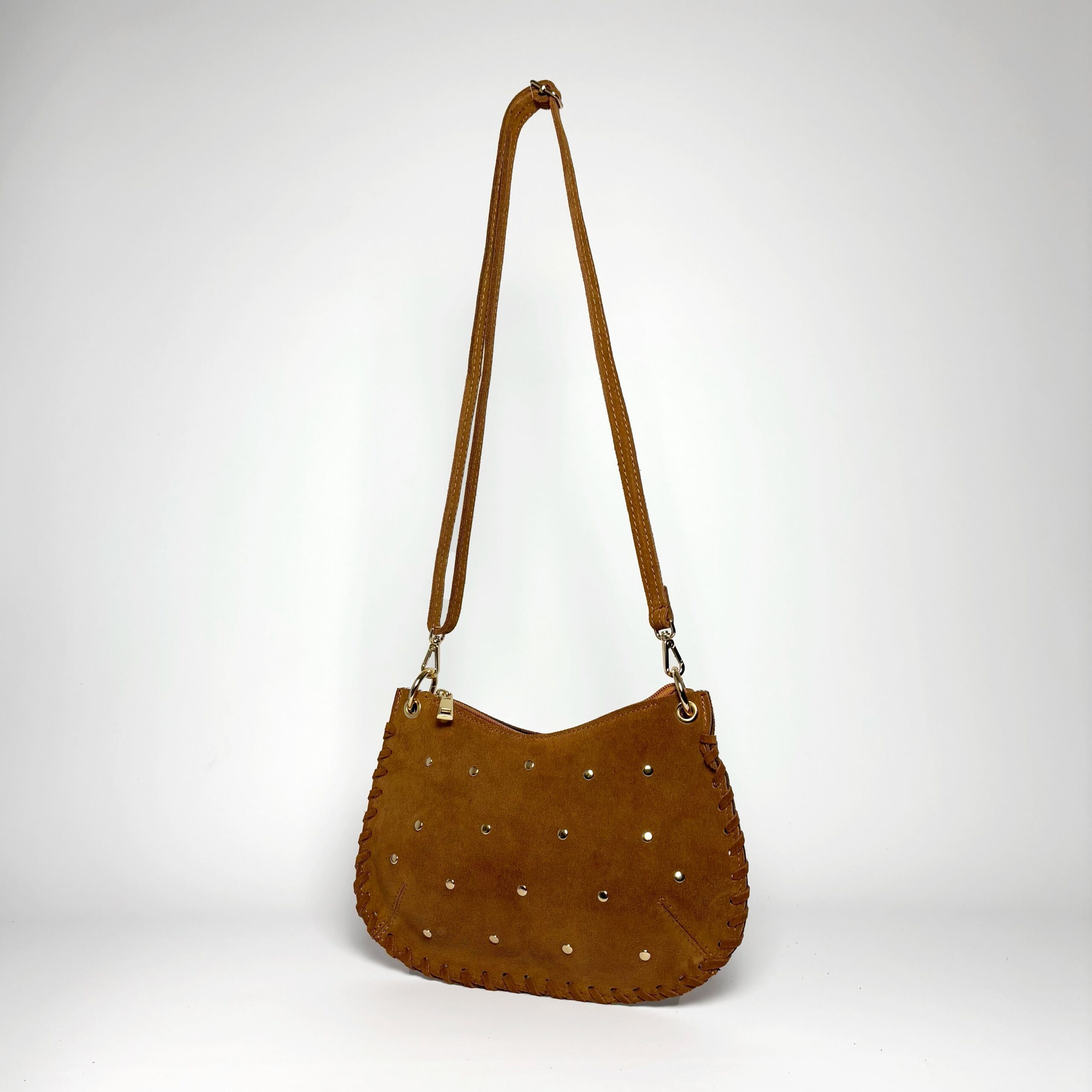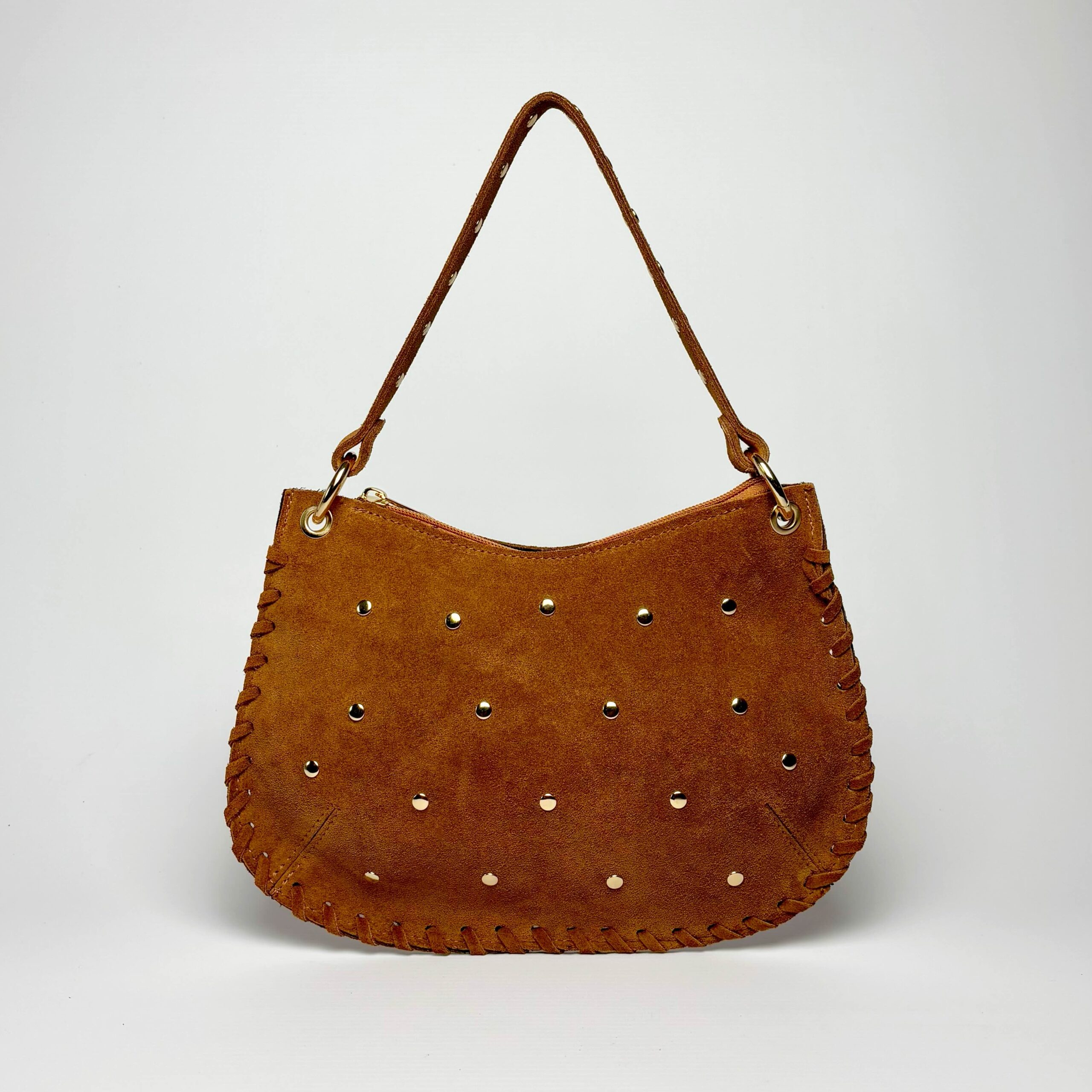 Sac en cuir suédé camel doré orné de clous dorés, bord lacé artisanal et fermeture zippée. Une pièce élégante, lumineuse et affirmée.