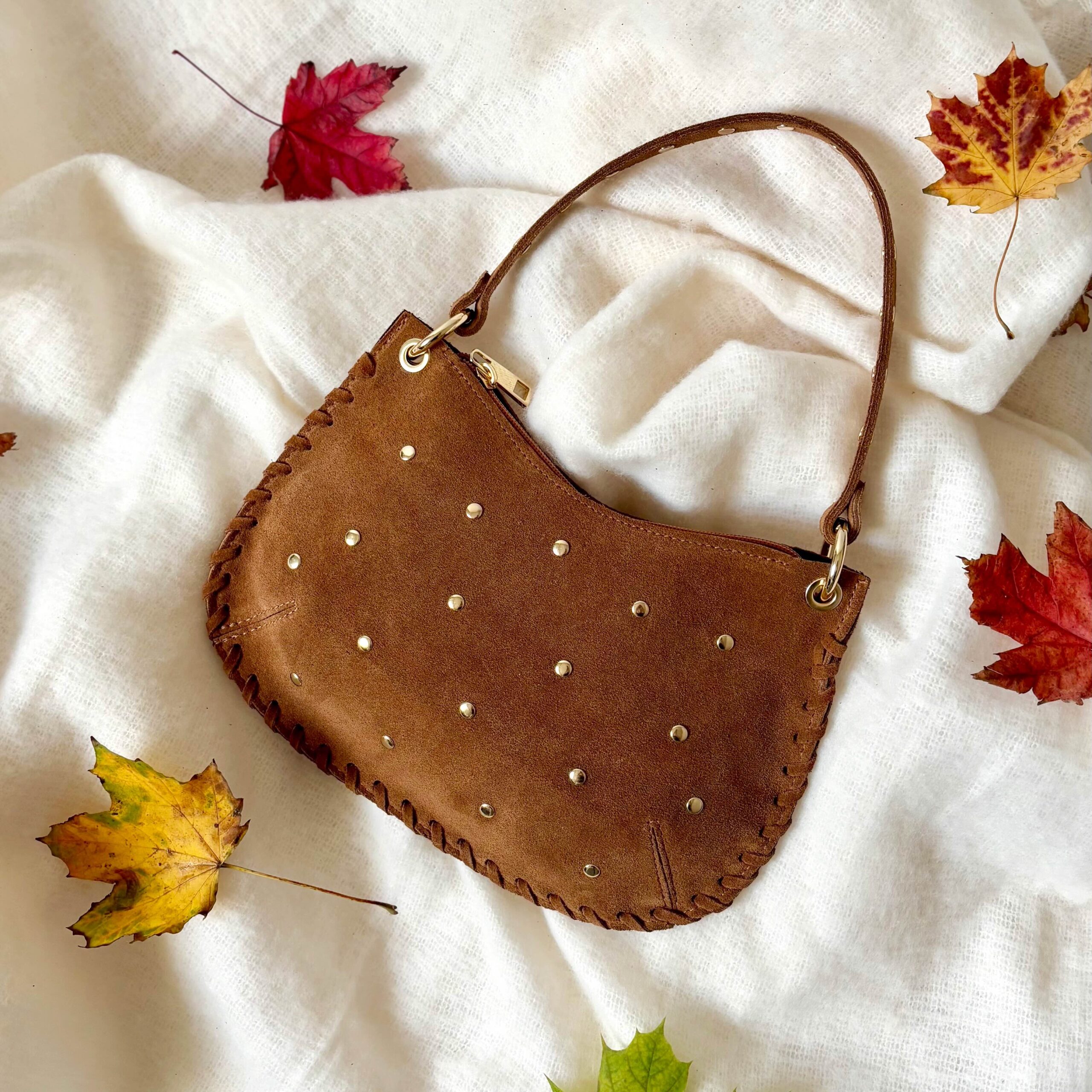 Un cuir suédé profond, un camel doré chaleureux, une constellation de clous dorés : Lume est une pièce lumineuse, conçue pour celles qui aiment les sacs au caractère affirmé et délicat à la fois.
