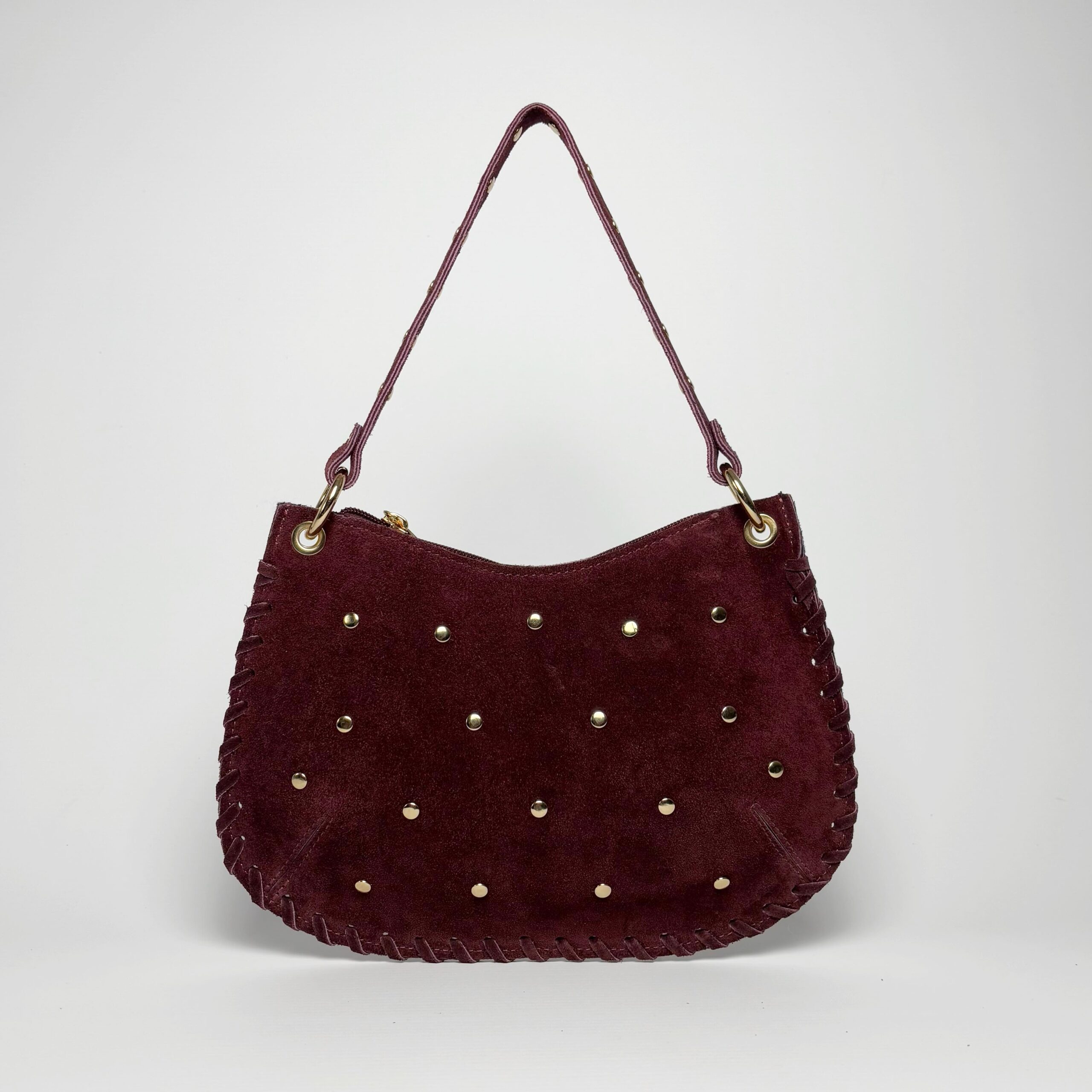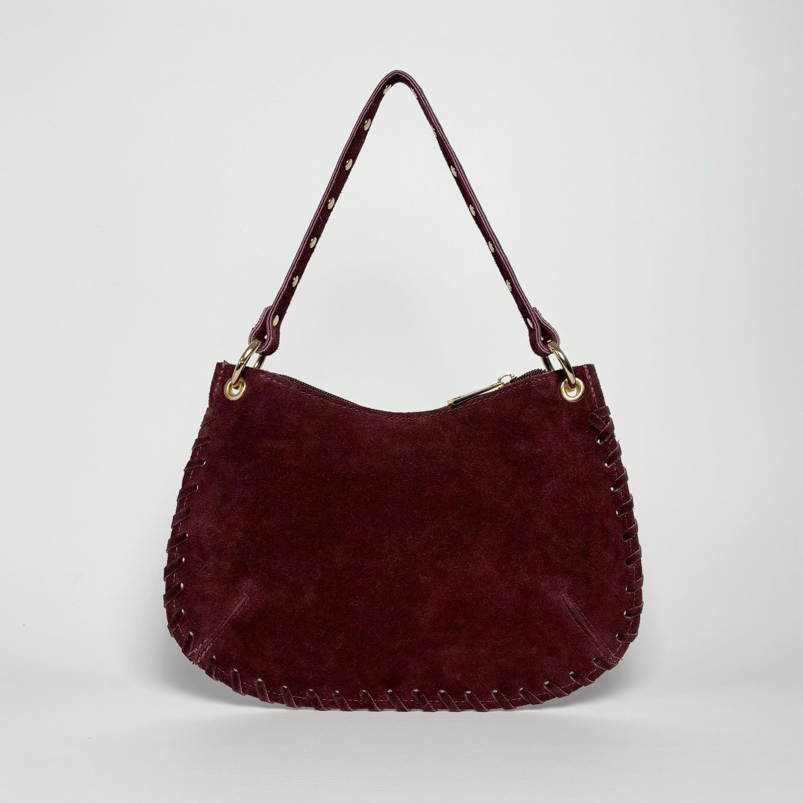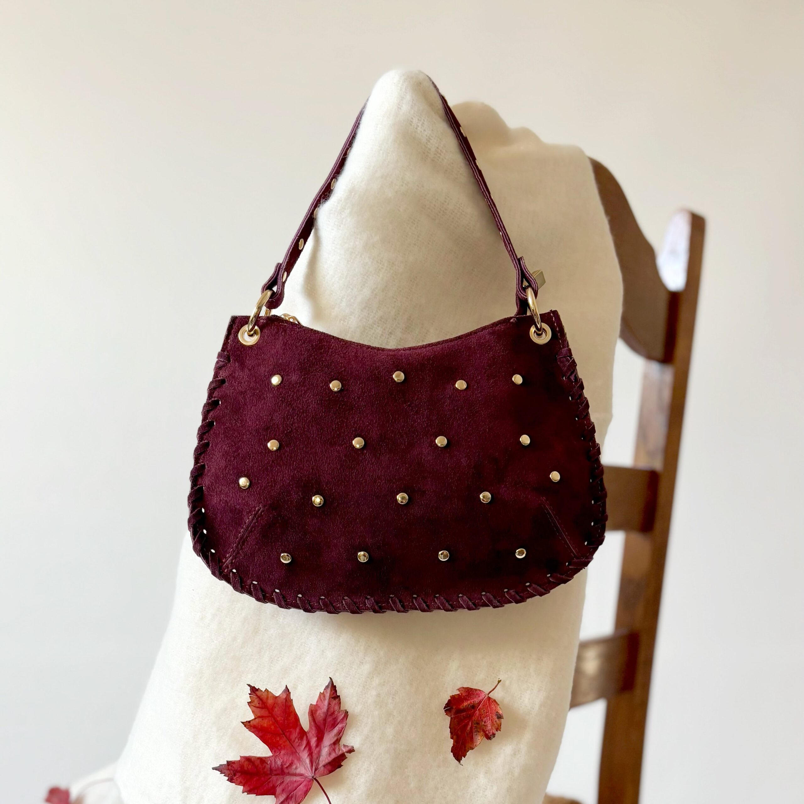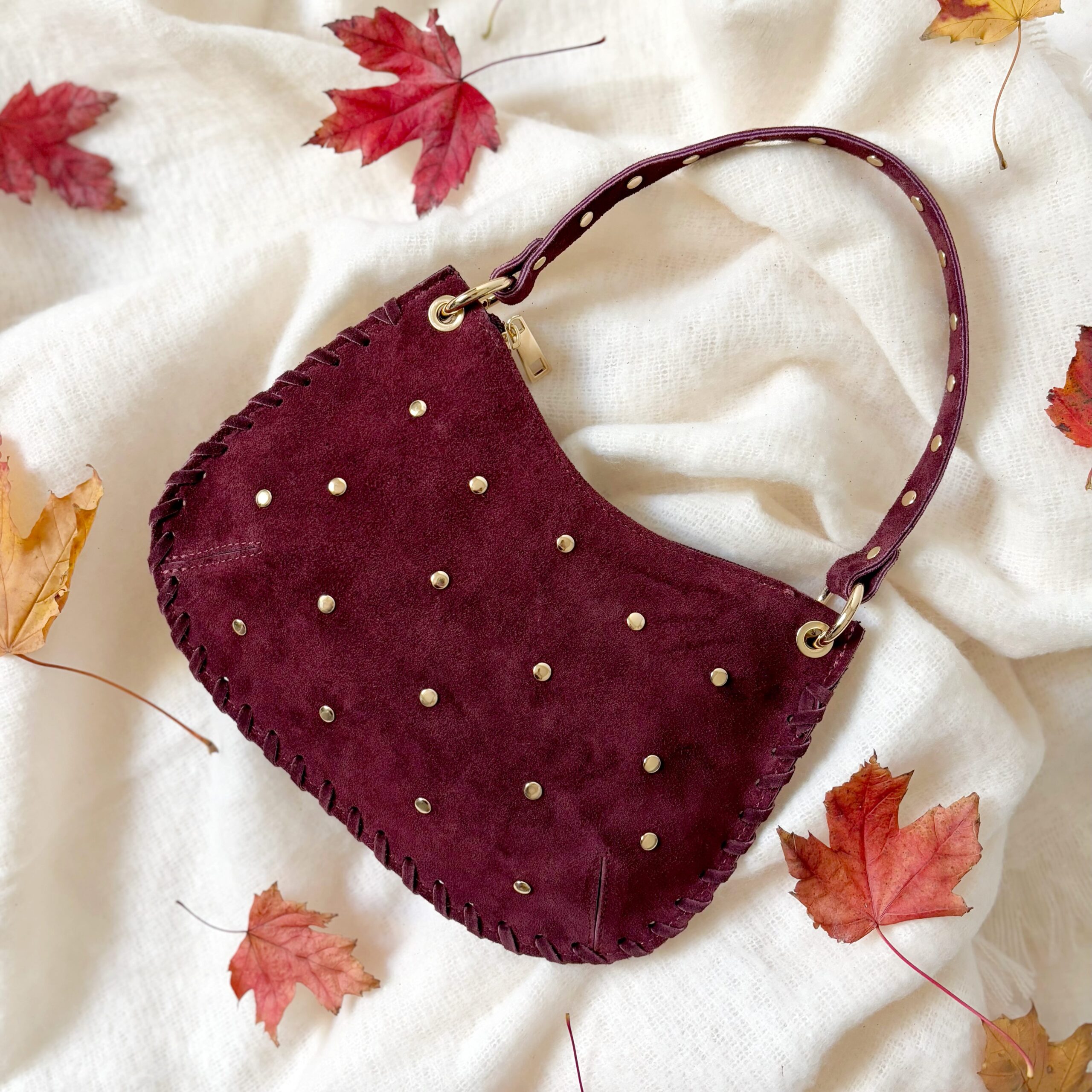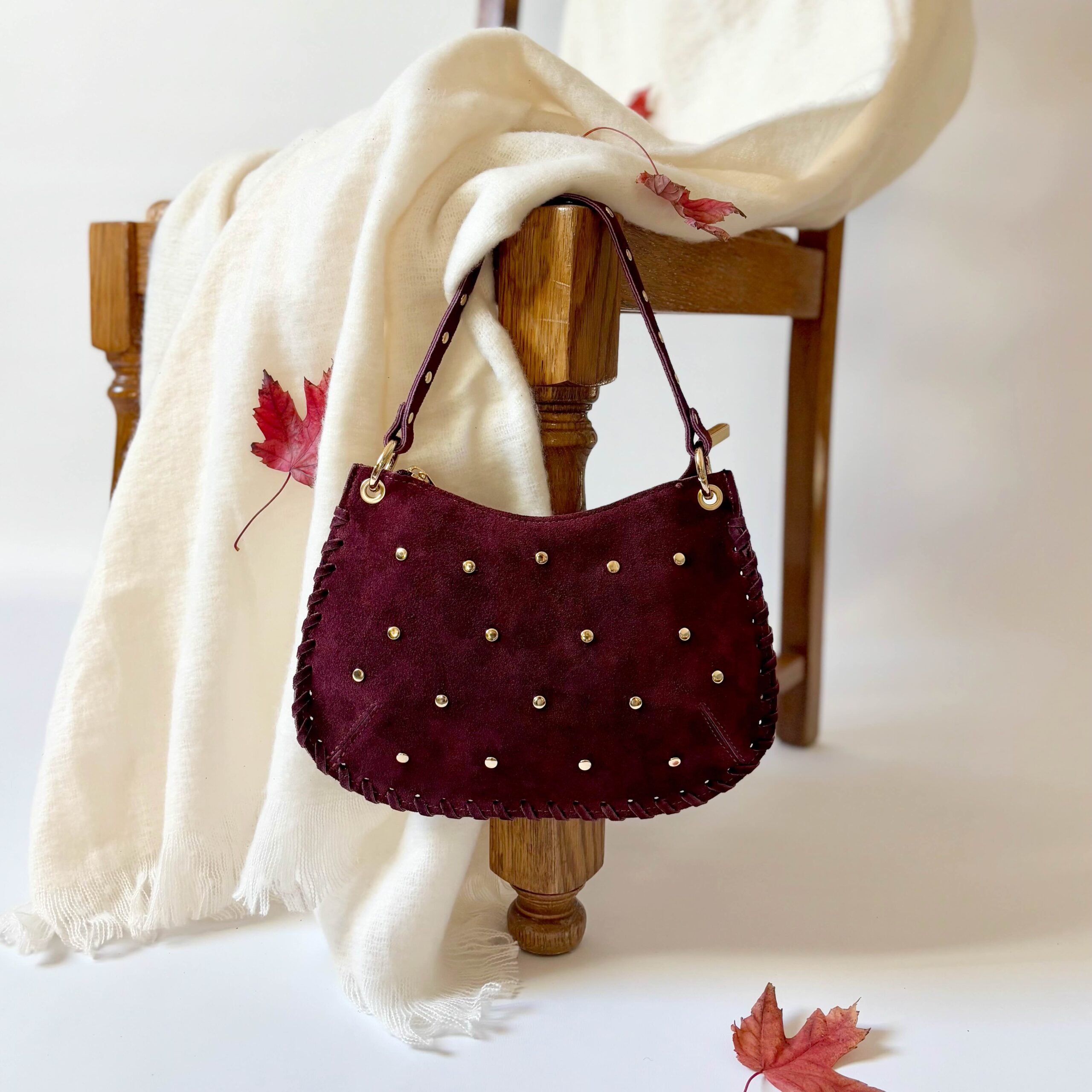 Un cuir suédé profond, un rouge carmin vibrant, une constellation de clous dorés : Lume est une pièce lumineuse, conçue pour celles qui aiment les sacs au caractère affirmé et délicat à la fois.